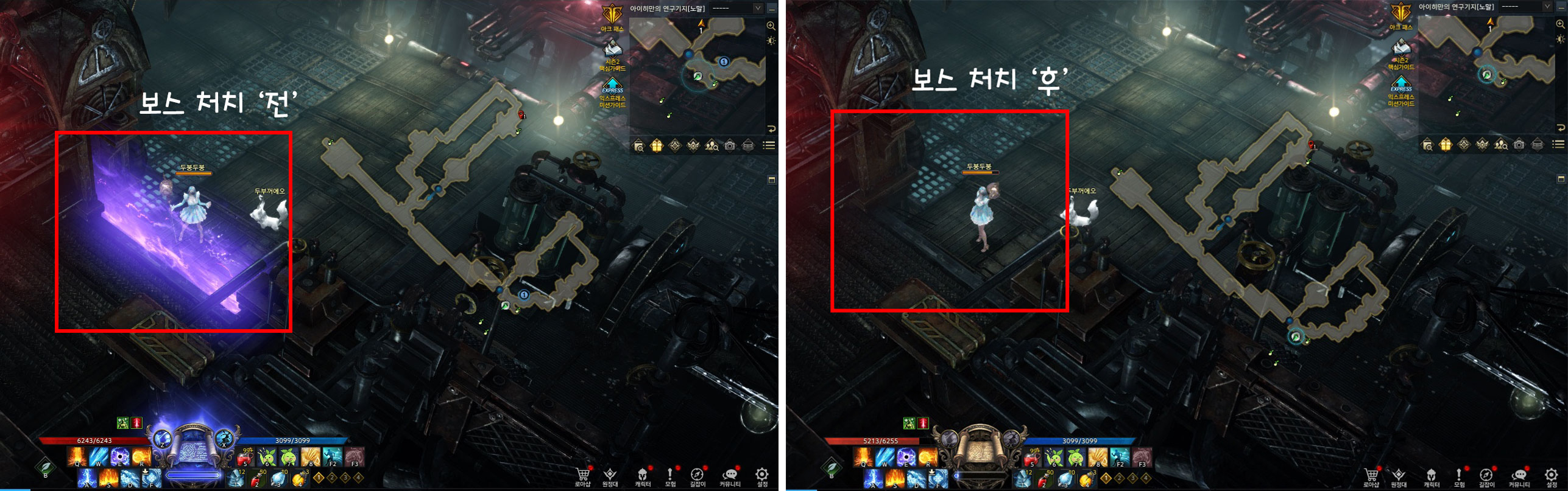 던전에 처음 입장했을 때에는 왼쪽과 같이 보라색 장막이 있어 들어갈 수 없지만