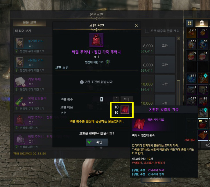 에반이 팔고있는 '비닐주머니 : 질긴 가죽 주머니'는 '온전한 빛깔의 가죽' 10개로 교환 가능한데요.