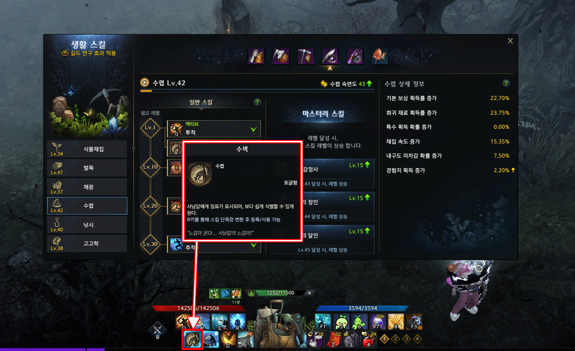 '수색' 스킬을 ON 상태로 해주면 채집물/채광물에 수렵물이 숨어있을 때