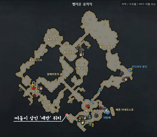떠돌이 상인 '에반'은 베른 남부의 벨리온 유적지의 표시된(지도 참고) 위치에 등장합니다.