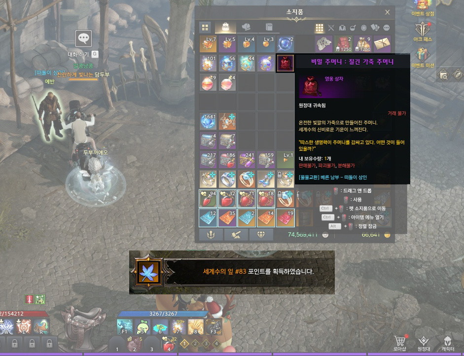 [세계수의 잎 #83]은 베른 남부 떠돌이 상인 NPC '에반'에게서 얻을 수 있습니다.